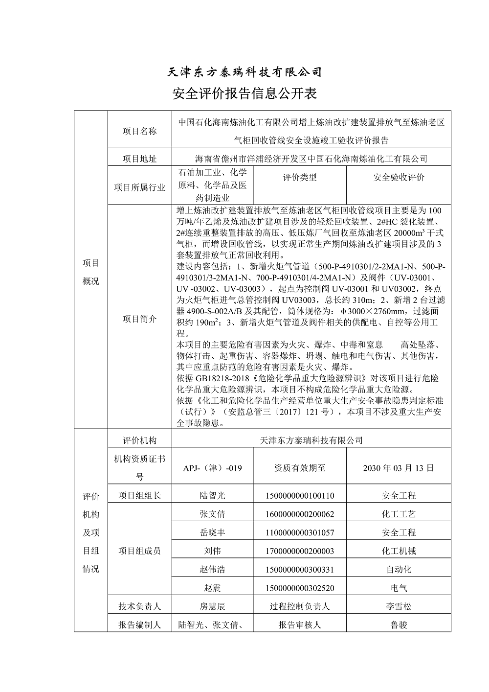中国石化海南炼油化工有限公司增上炼油改扩建装置排放气至炼油老区气柜回收管线安全设施竣工验收评价报告 更新时间:2026-01-07 点击:164 所属栏目:项目公示 Update Time:2026-01-07 Hits:164 Belong Column:Project publicity