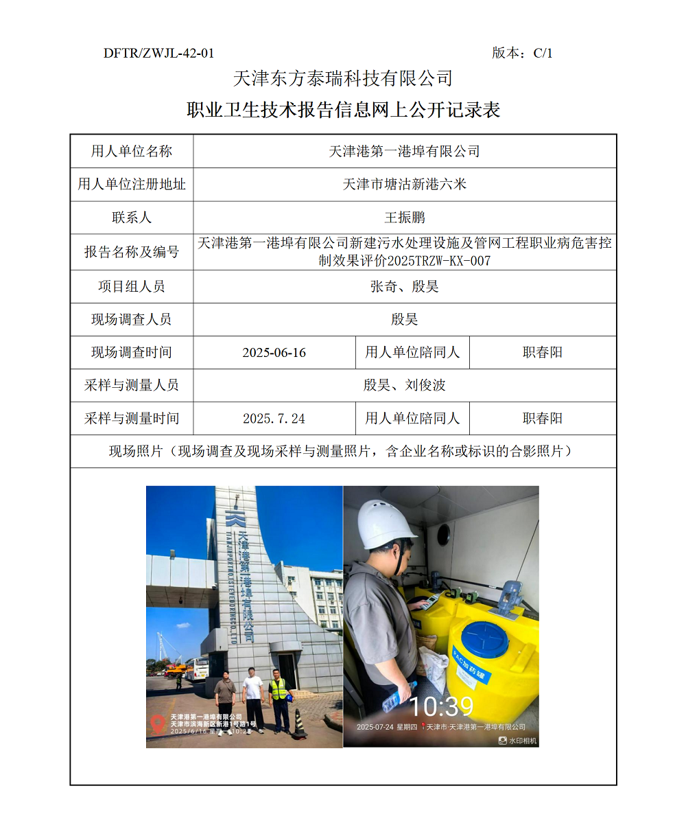 天津港第一港埠有限公司新建污水处理设施及管网工程职业病危害控制效果评价2025TRZW-KX-007 更新时间:2026-01-09 点击:156 所属栏目:项目公示 Update Time:2026-01-09 Hits:156 Belong Column:Project publicity