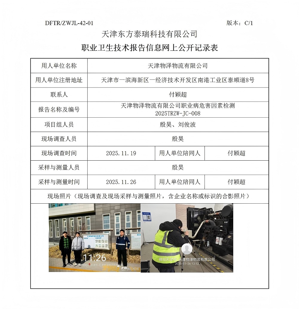 天津物泽物流有限公司职业病危害因素检测2025TRZW-JC-008 更新时间:2026-01-15 点击:146 所属栏目:项目公示 Update Time:2026-01-15 Hits:146 Belong Column:Project publicity