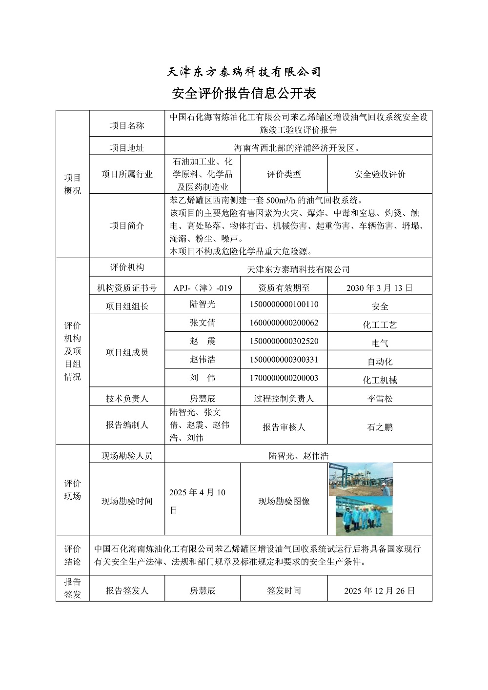 中国石化海南炼油化工有限公司苯乙烯罐区增设油气回收系统安全设施竣工验收评价报告 更新时间:2026-01-22 点击:106 所属栏目:项目公示 Update Time:2026-01-22 Hits:106 Belong Column:Project publicity