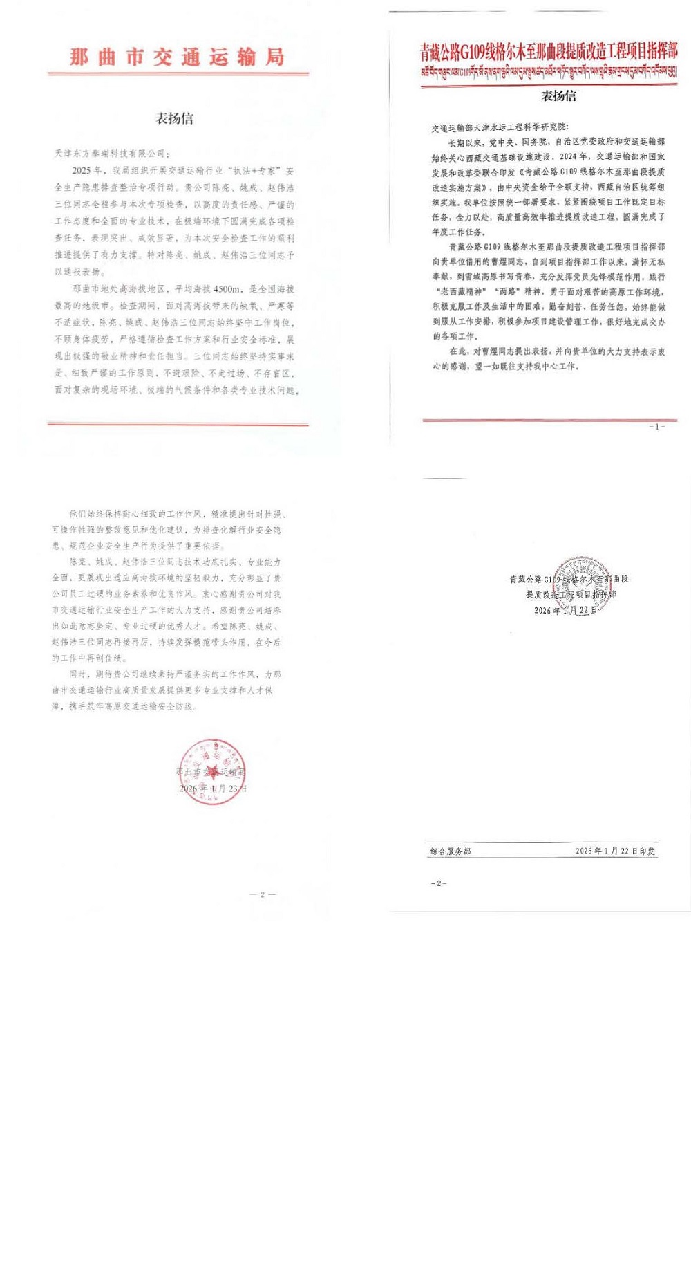 更新时间: 点击:95 所属栏目:公司新闻 Update Time: Hits:95 Belong Column:News近期,东方泰瑞公司交通安全技术团队持续深化与西藏自治区交通运输厅及各地(市)交通局的合作,以现场技术服务为手段、隐患排查清零为抓手,全力支撑自治区“2026年春运春节交通运输安全生产重大风险隐患排查整治和元旦春节交通运输安全生产重大危险源提级管控重点巡查”工作,为雪域高原交通强国建设筑牢安全保障。