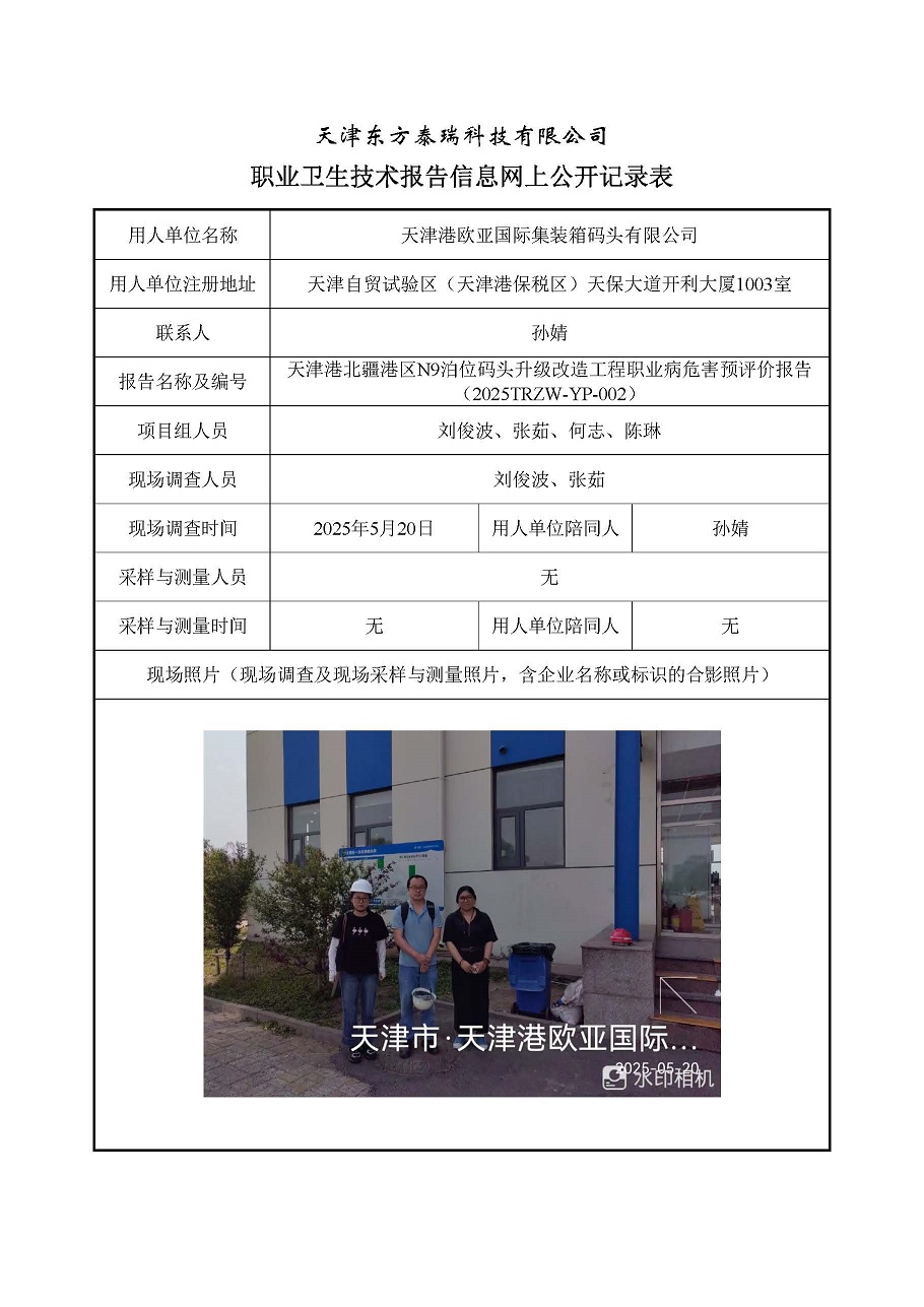 职业卫生技术报告信息网上公开记录表(天津港北疆港区N9泊位码头升级改造工程职业病危害预评价报告) 更新时间:2025-10-30 点击:133 所属栏目:项目公示 Update Time:2025-10-30 Hits:133 Belong Column:Project publicity
