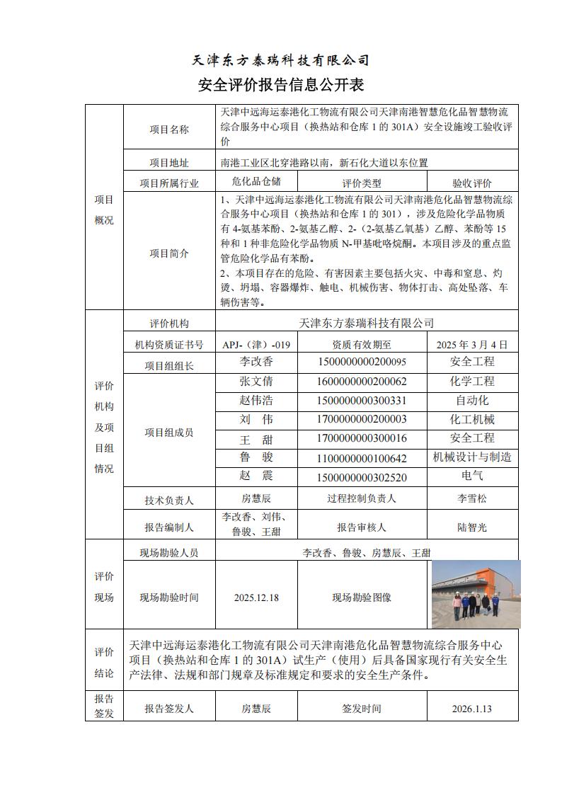 天津中远海运泰港化工物流有限公司天津南港智慧危化品智慧物流综合服务中心项目(换热站和仓库 1 的 301A)安全设施竣工验收评价 更新时间:2026-03-19 点击:105 所属栏目:项目公示 Update Time:2026-03-19 Hits:105 Belong Column:Project publicity