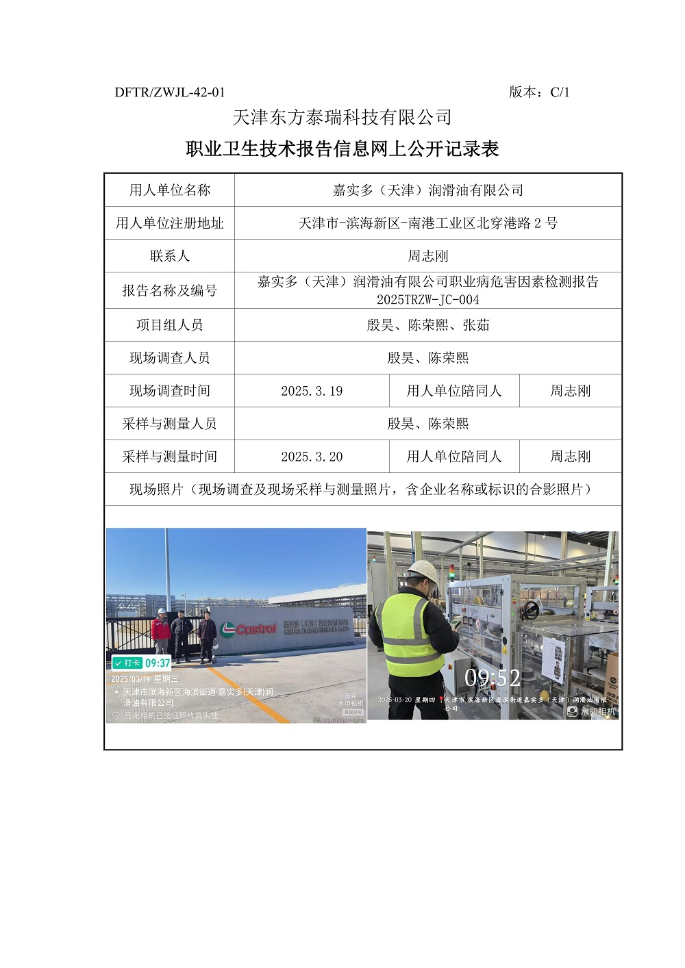 嘉实多(天津)润滑油有限公司职业病危害因素检测报告2025TRZW-JC-004 更新时间:2025-05-29 点击:39 所属栏目:项目公示 Update Time:2025-05-29 Hits:39 Belong Column:Project publicity