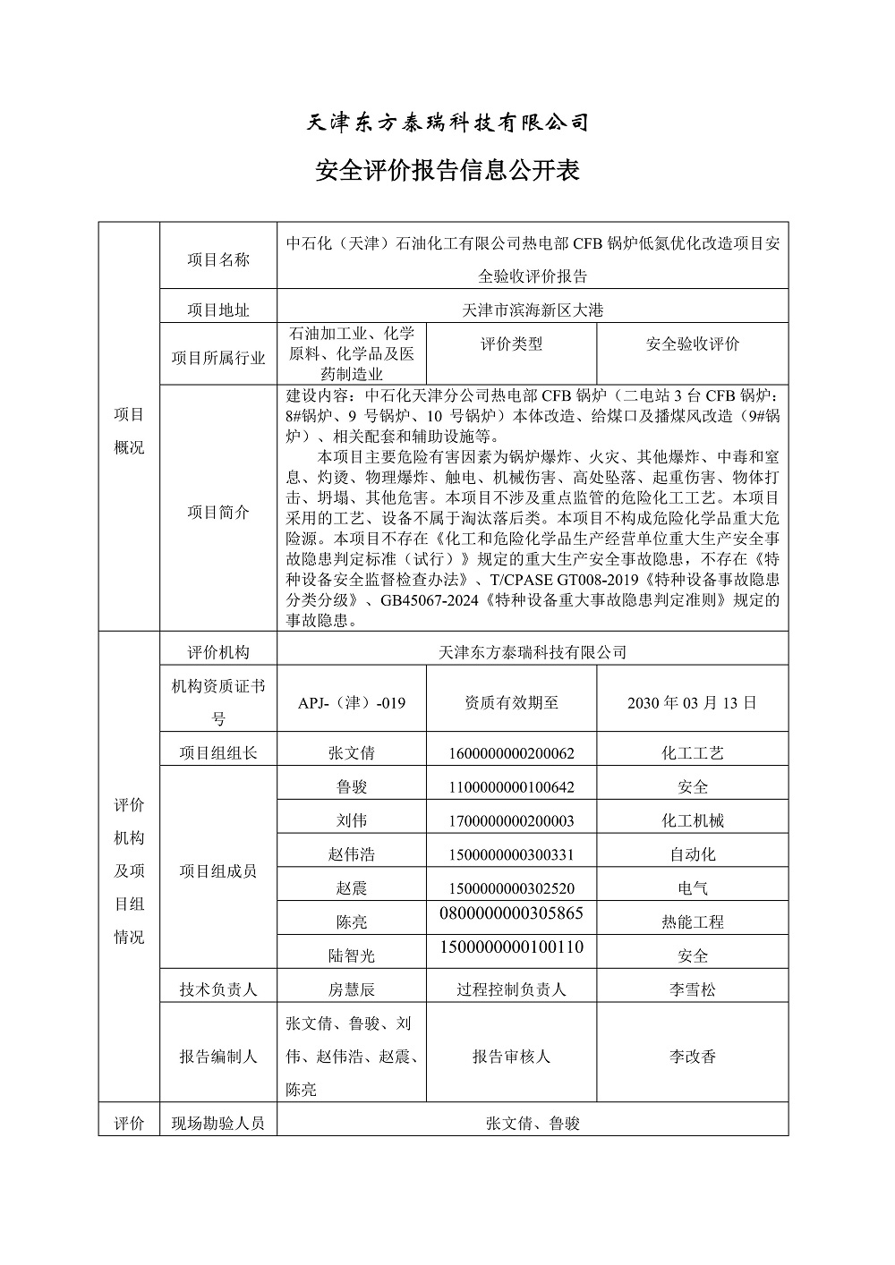 中石化(天津)石油化工有限公司热电部 CFB 锅炉低氮优化改造项目安全验收评价报告 更新时间:2026-04-08 点击:17 所属栏目:项目公示 Update Time:2026-04-08 Hits:17 Belong Column:Project publicity