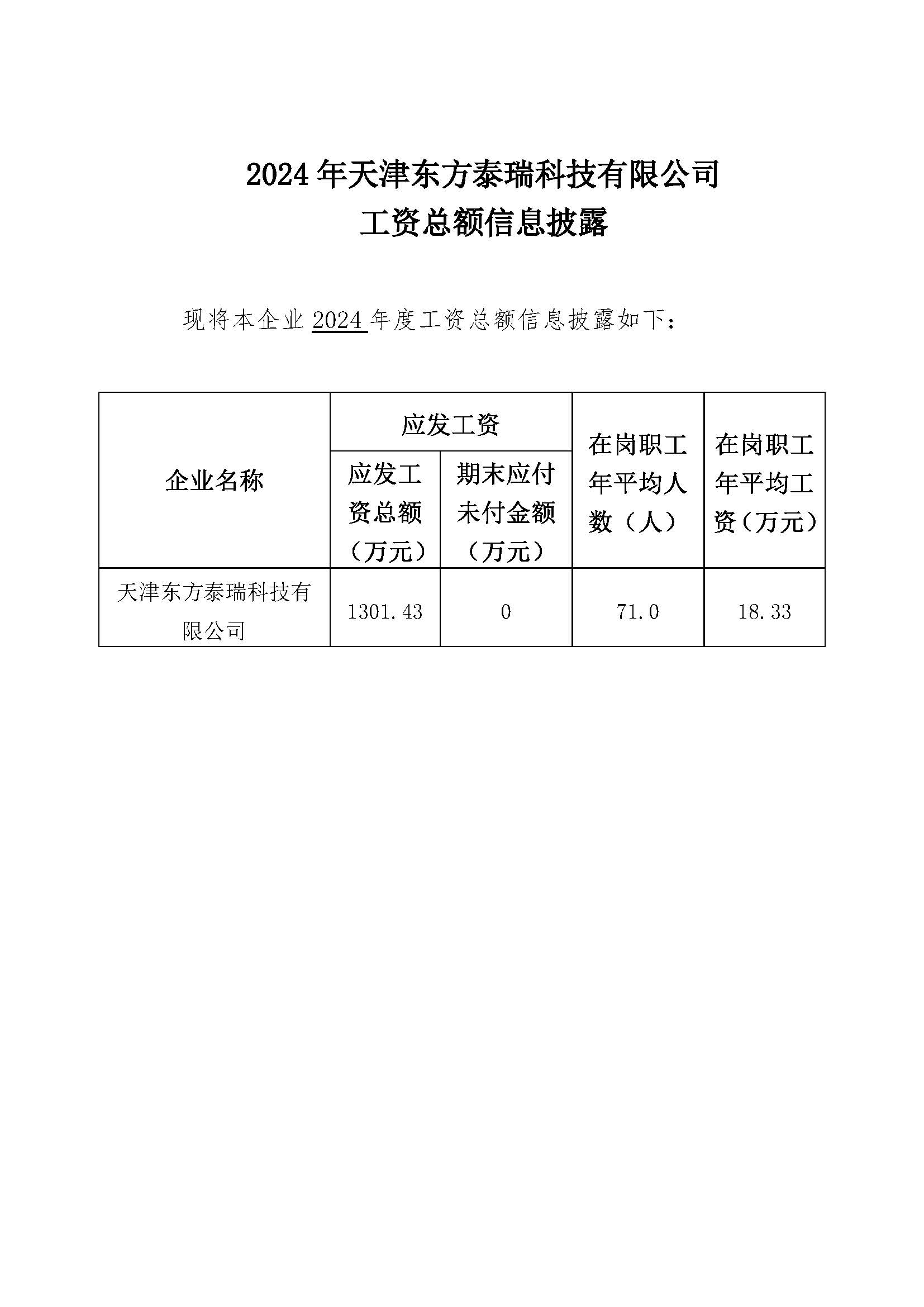 2024年天津东方泰瑞科技有限公司工资总额信息披露 更新时间:2025-09-04 点击:101 所属栏目:信息公开 Update Time:2025-09-04 Hits:101 Belong Column:Service enterprise